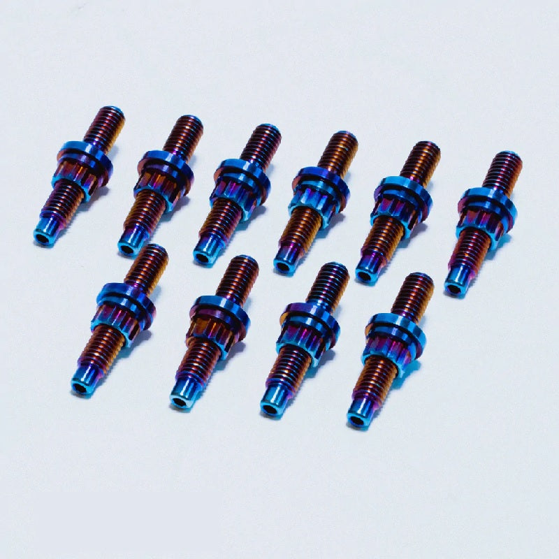 Titanium is ~45% lighter, stronger, and will not corrode like your stock steel bolts or studs! Each stud/washer/nut assembly weighs only 11.5g!