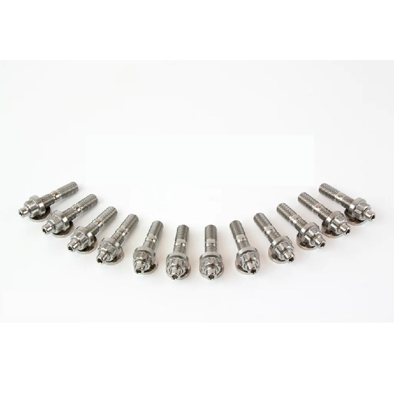 Estos pernos de titanio SpeedFactory están hechos de Ti 6Al-4V e incorporan una punta de llave hexagonal de 4 mm que permite instalarlos fácilmente con una llave Allen. Se incluyen tuercas y arandelas de titanio de 14 mm y 12 puntas.