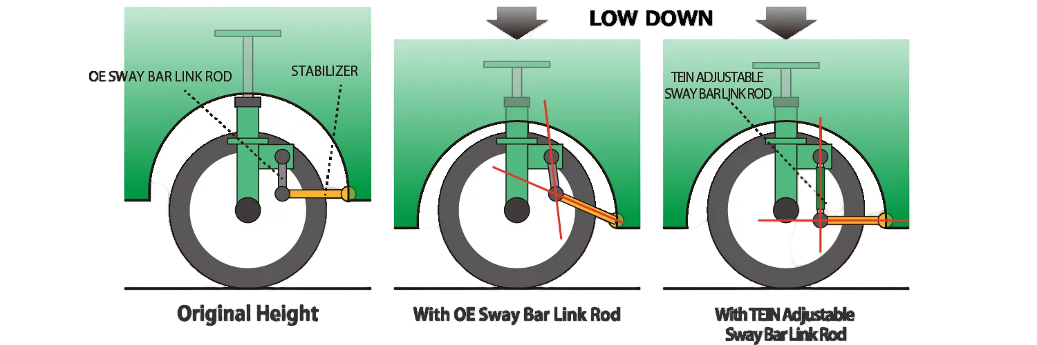 Adjustable link rods allow you to adjust the stabilizer angle which is altered when the car's ride height is lowered or lifted. Fine & precise adjustment in millimeters for optimum angle. Easy installation - simple replacement of OE parts.