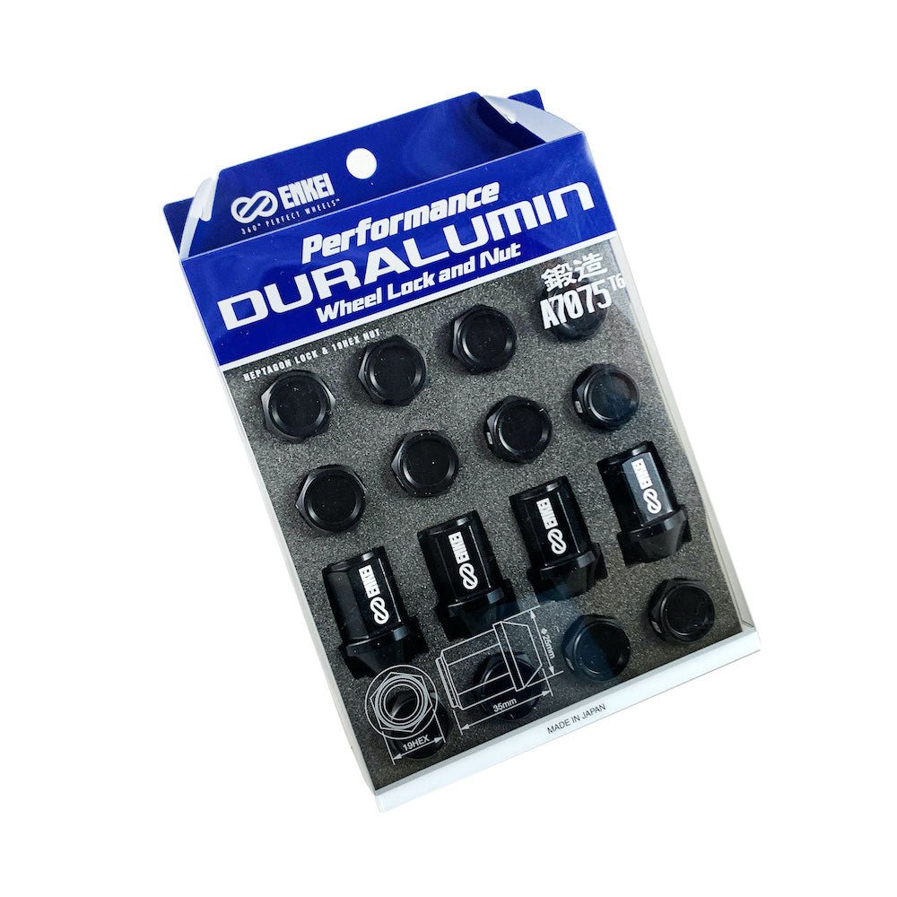 Los juegos de tuercas y cerraduras de rueda Enkei Duraluminio están hechos de aluminio liviano y de alta resistencia y tienen acabados en azul, rojo o negro.