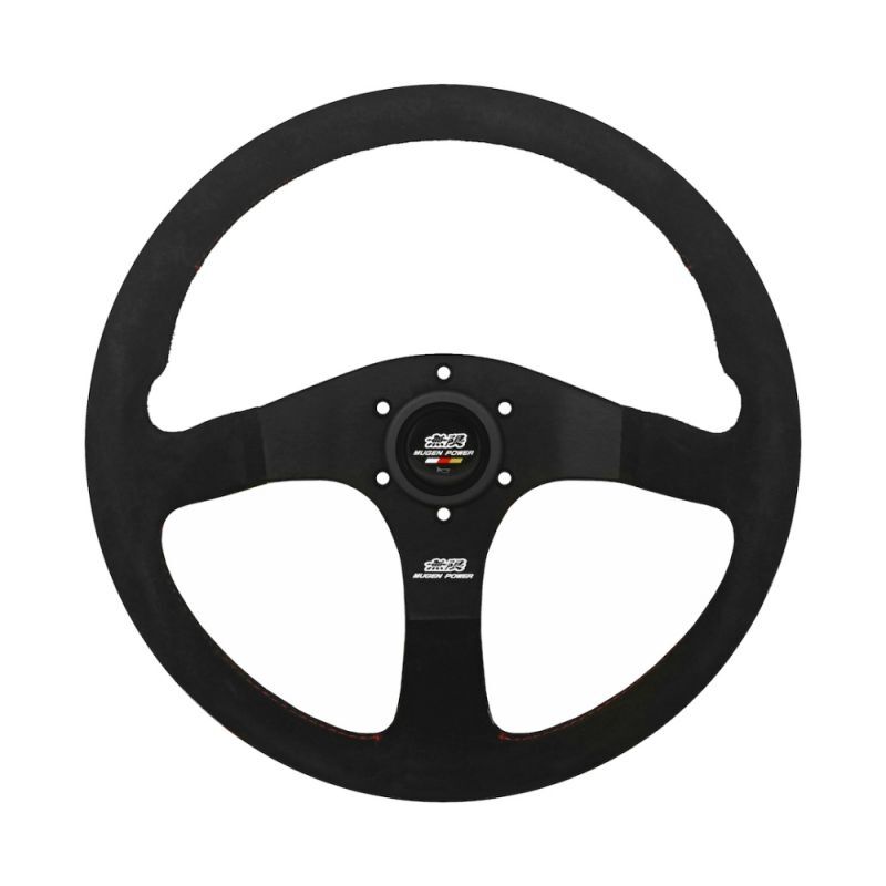 Volantes Mugen de competición de tipo plano, de 350 mm de diámetro y forrados en piel de ante. Perfectamente adecuados para uso en carretera y en pista, son cómodos en la mano y aportan un toque de clase Mugen a tu experiencia de conducción.